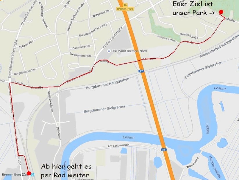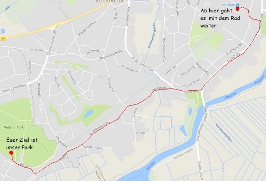 Falls Ihr lieber in Ritterhude aus dem Zug aussteigt, müsst Ihr runter und auf der Riesstraße rauf,