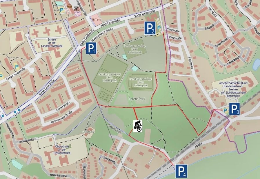 Es sind nur circa 2,5 km zum Pellens Park. Vom Bahnsteig aus müsst Ihr in Zugfahrtrichtung weiter.